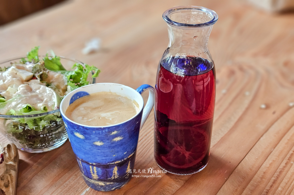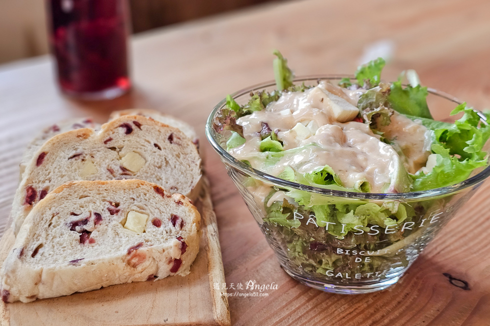 下午茶 A 餐是生菜沙拉+切片麵包+任選飲品一杯。這生菜沙拉是魚菜共生的生菜,新鮮翠綠。沙拉醬口味普通。