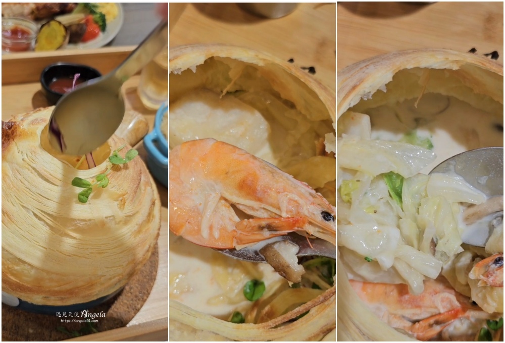 有魚有蝦奶油燉菜,最吸引人的就是這圓澎澎的酥皮,又圓又酥的酥皮,一開始真不知道該從哪下手吃起。Angela 我是酥皮兩吃,先從中間往下壓洞讓酥皮泡在奶油燉菜中,可以搭配著裡面的燉菜一起吃,這是吃軟綿的口感。