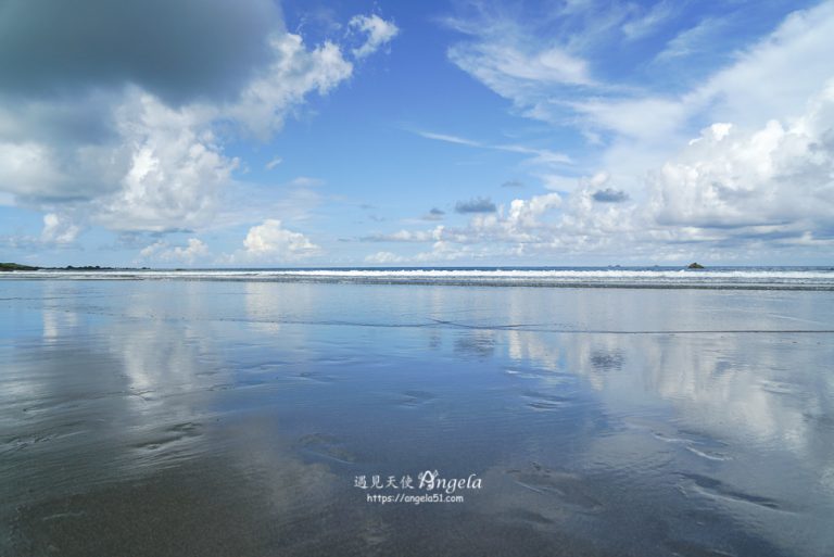 這次 Angela 是開始退潮的 2 小時後抵達,基本上都歷海灘的海水還沒退的很遠,要往左邊走才有比較平緩的淺灘水面適合拍照。建議最好開始退潮後的 3小時後來,這樣淺灘的範圍更大會更好拍。另外,下午的退潮時間比早上退潮時間,陽光的方向比較適合拍出唯美的天空之鏡照片。