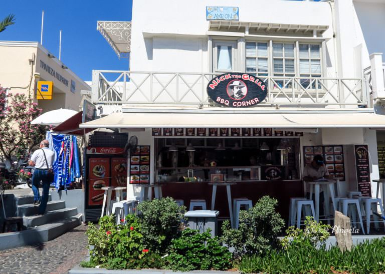 Santorini 聖托里尼美食,來介紹Fira有哪些美食餐廳值得推薦。在費拉想要吃平價美食,在費拉公車總站附近最多,常見的希臘國民美食Souvlaki 在這邊就有兩三家,其中以 fira mama’s house 斜對面的 Luck’s Souvlakis 評價最高,當然Nick The Grill Santorini 也有滿多人推薦的,各有所好。