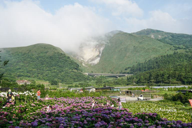 陽明山繡球花季期間如果不想人擠人的賞花,建議可以到大賞園繡球花田,位在竹子湖頂湖的大賞園繡球花田最大的特色就是有小油坑的自然背景,遊客相對於高家繡球花園與大梯田來說會少一些。