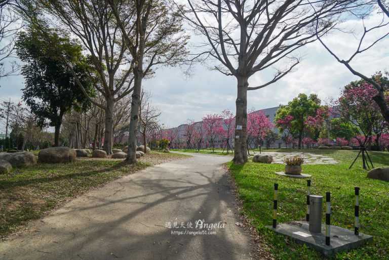 中科崴立櫻花公園沿著河畔兩岸種的櫻花盛開時,紅綠相間的畫面滿吸引人的目光。取局部櫻花大道的景觀,不說還以為這是在郊外的美景。