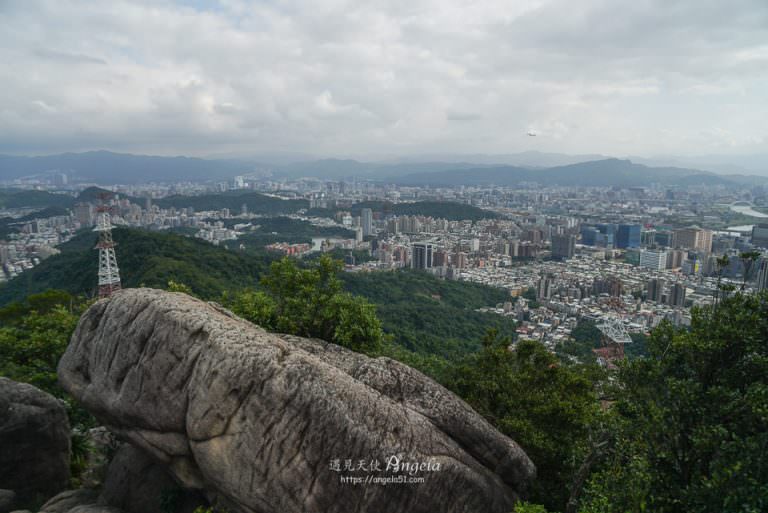 想去拍絕美的北市景畫面,要繼續往論劍亭上方的步道走。續往上走會再遇到叉路,一樣往右邊走,不到1分鐘就會看到剪刀石區的平台。這邊就是網美拍照打卡的地方,也是眺望台北市景的好地方,而且還可以看到飛機升空的美麗畫面。