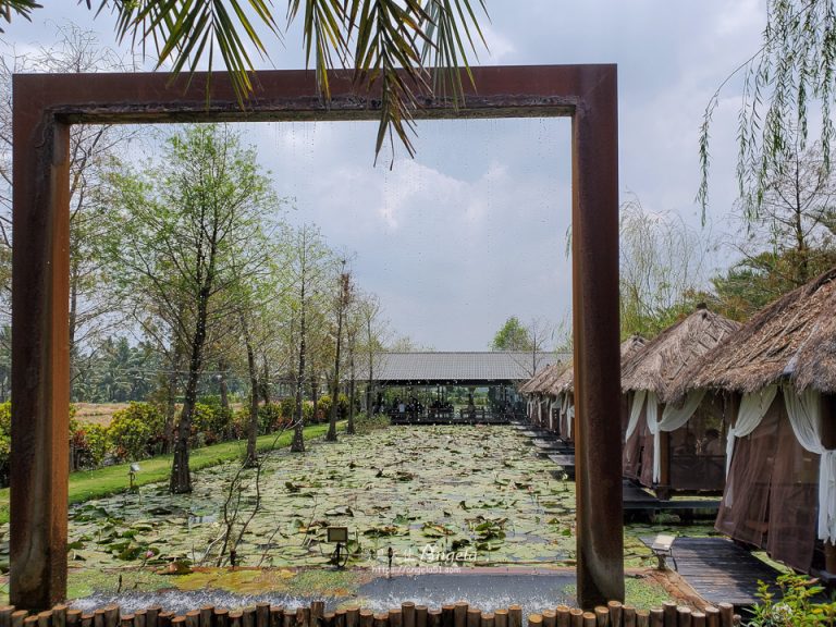 門口的九重葛花開的艷麗,一踏進來視野景觀就完全不同。偌大的蓮花池田,峇里島常見的發呆亭,一整排的座落蓮花池中。就是這幅畫面太美!撇開周邊的魚塭景觀,正看水明漾餐廳的景觀,這裡真的很有南洋的慵懶風格。