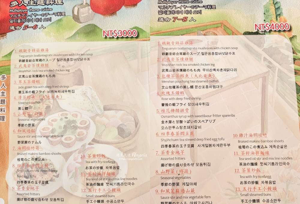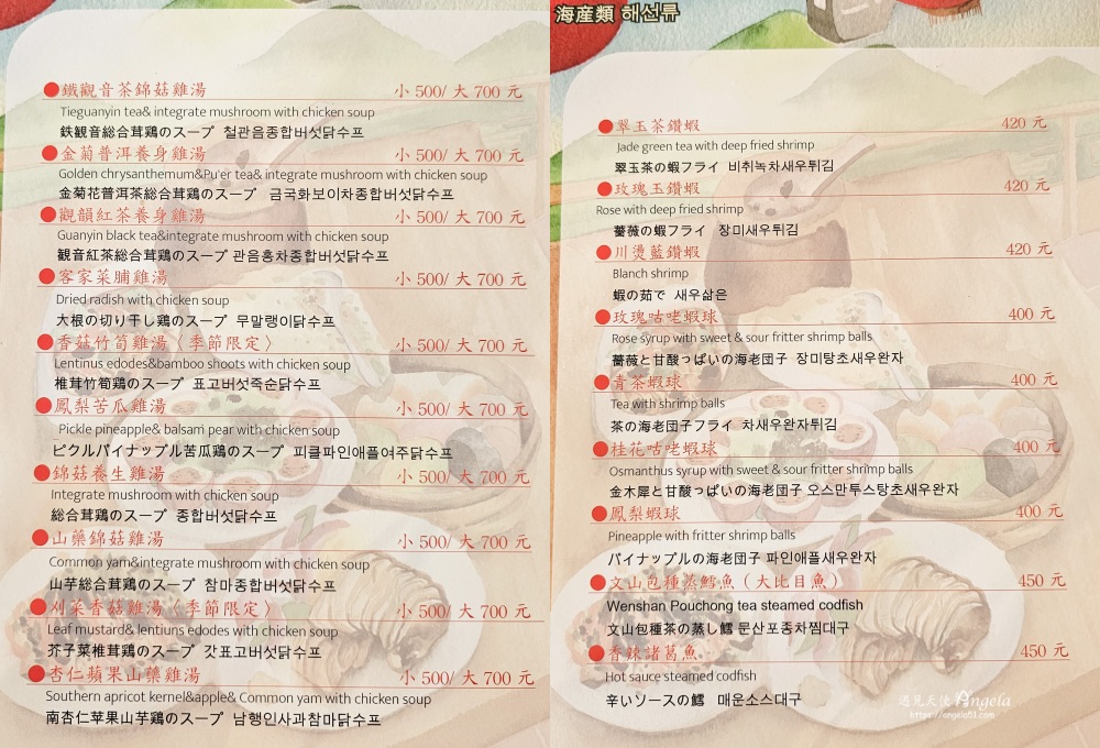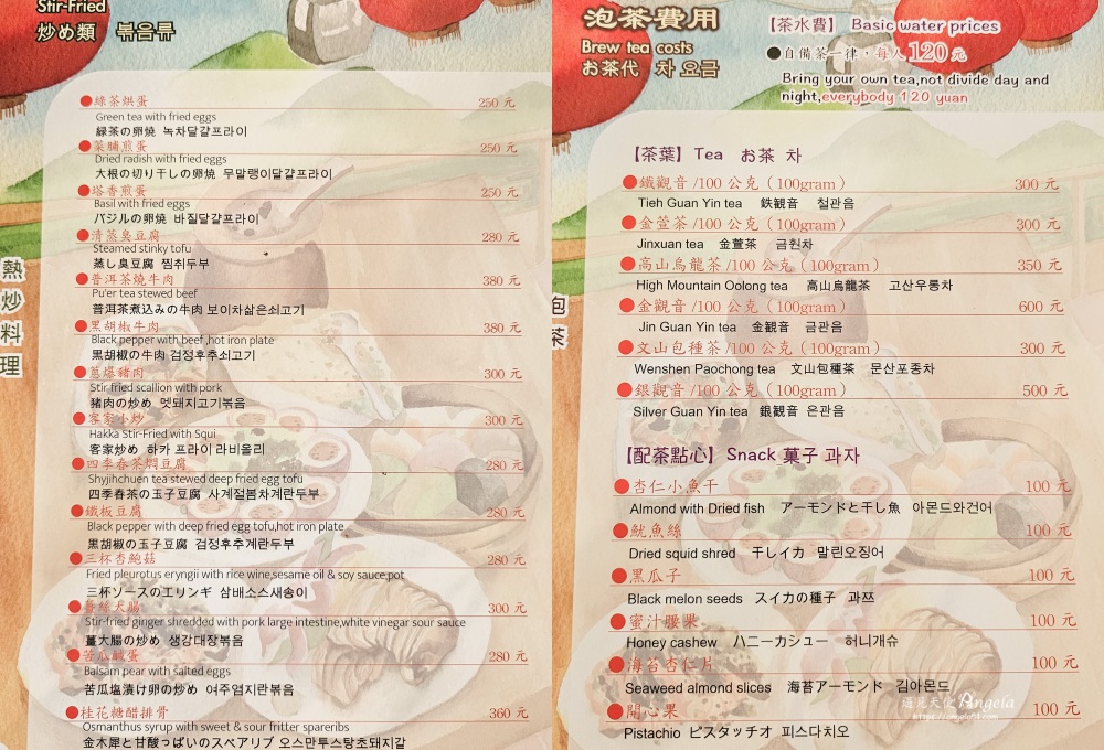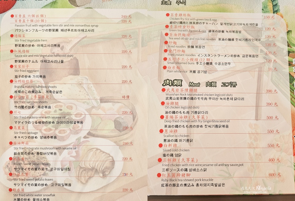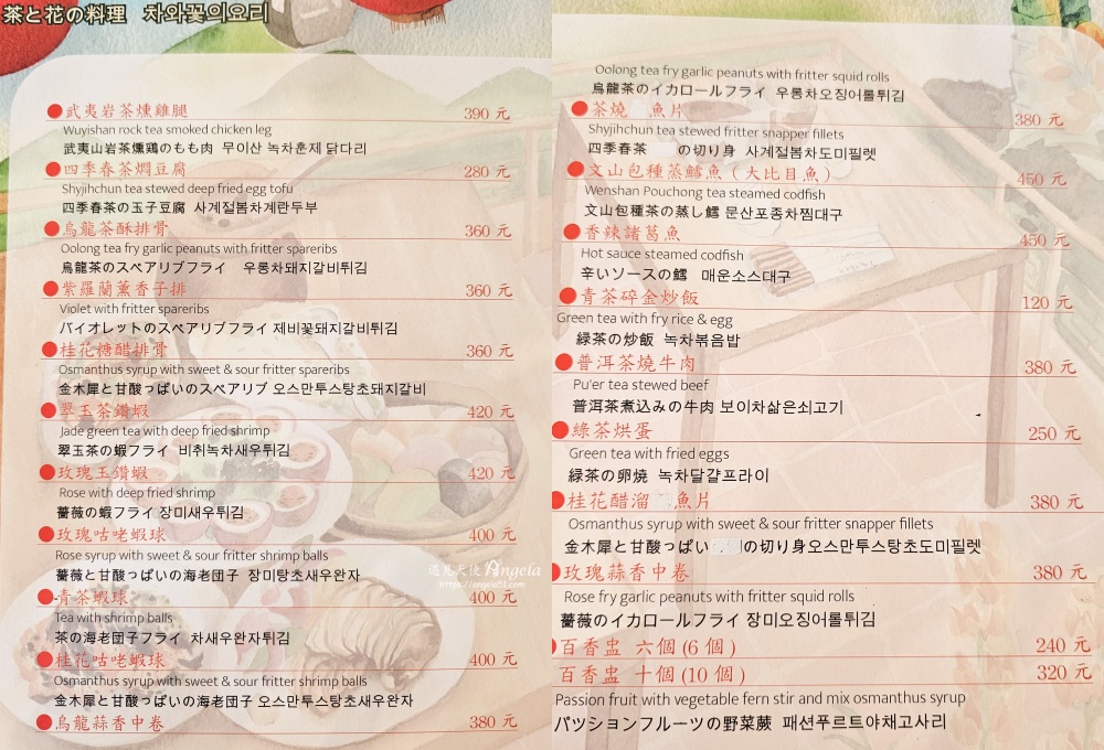 店內菜單有依人數設計的合菜菜單,也可以單點。店內特色菜是茶與花料理。平均消費一人約 500 元。