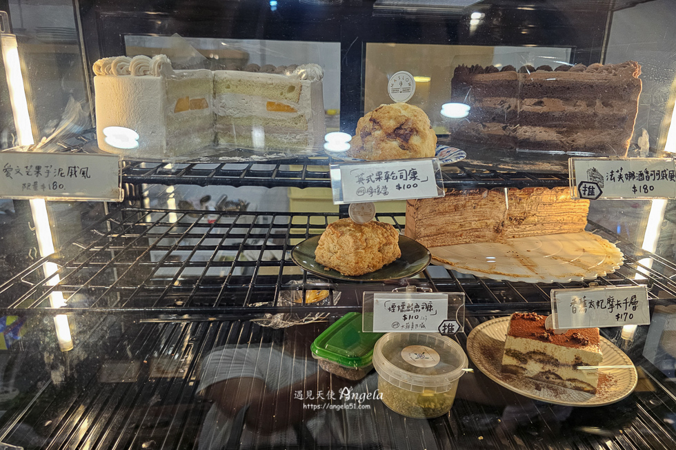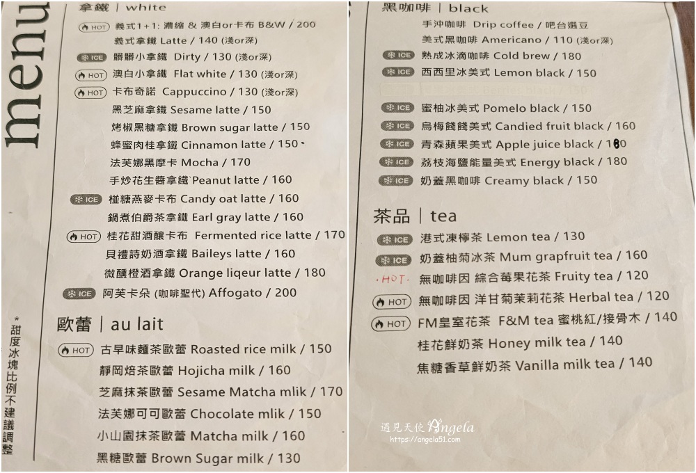 當天提供的甜點與麵包都陳列在架上,每樣看起來都很誘人的想吃。飲料菜單如上圖,手沖咖啡的品項與價錢標示在櫃台。店內低消,5 歲以上每位一杯引,如有候位限時 90 分鐘。寵物繫繩提籃可入內,是三星寵物友善咖啡廳。