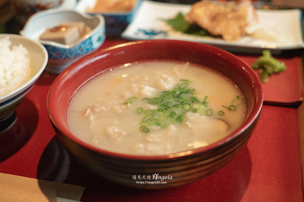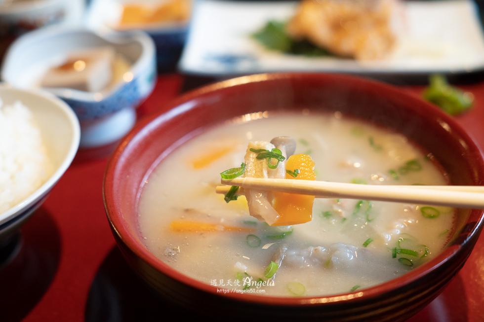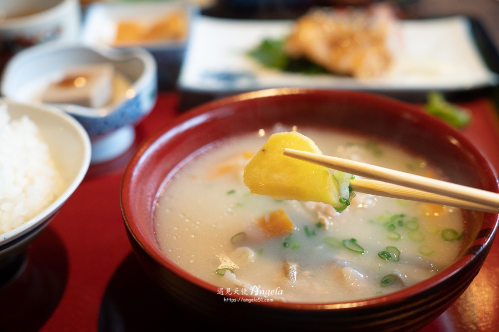 經典的菜色就是這碗熱熱的酒粕(酒糟)料理,裡面的配菜有豬肉、洋蔥、蘿蔔等,湯頭喝起來沒有酒味,只有淡淡的甘味。