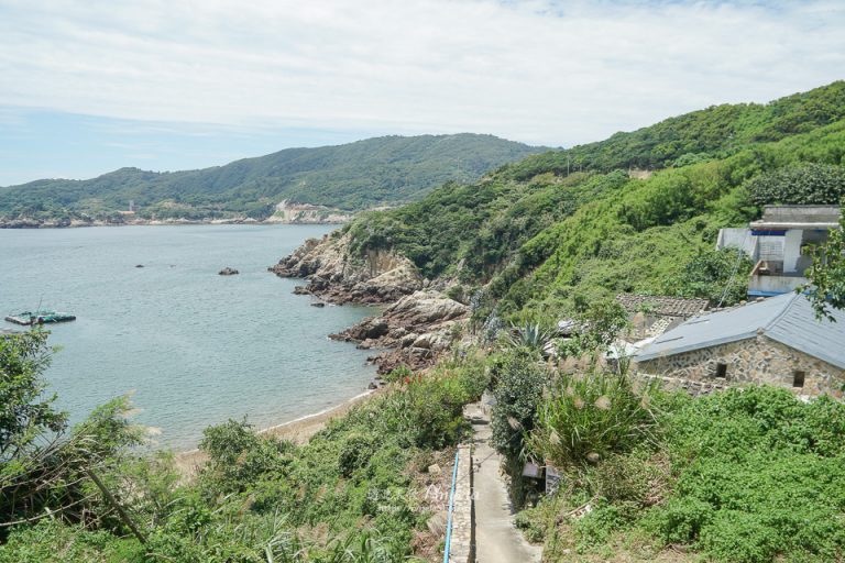 百年石頭屋的門前庭院有著綠意植栽,一旁擺設了幾張戶外座位,這個位置景觀很好,可以遠眺南竿福澳港美景。唯一小缺點是夏季白天太熱,雖然有風扇伺候,但熱度依舊。戶外區最適合下午 4 點以後過來,此時溫度宜人。