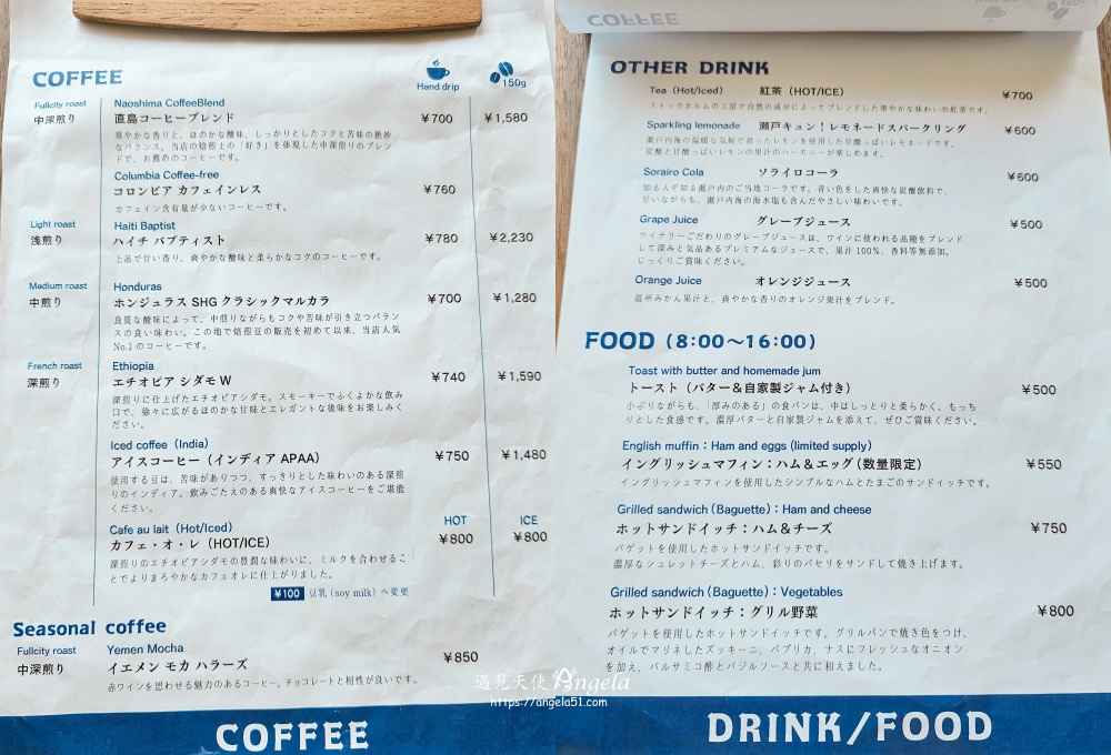 Naoshima Coffee 的咖啡是自家烘焙的,店內有台烘豆機。當天選擇了淺焙手沖咖啡,咖啡溫潤喝起來順口,質量好,可推薦。