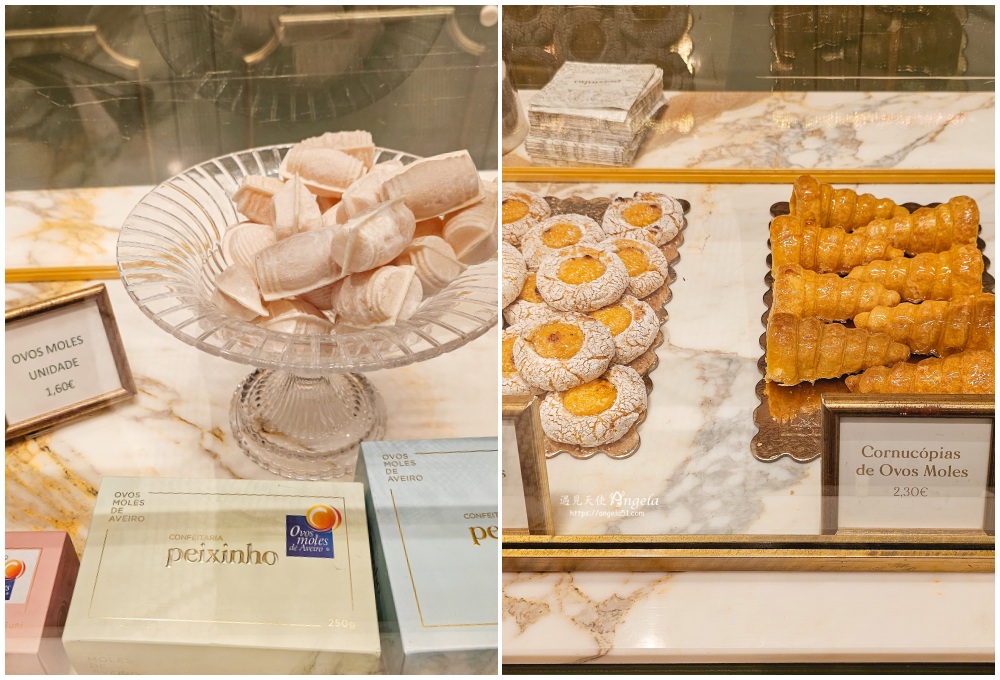 阿威羅軟蛋(Ovos Moles) 是葡萄牙列入歐盟指定地理標誌保護的食物,源自於阿威羅這個城市的修道院。在阿威羅有 2 家賣軟雞蛋的店家,都很受推薦。人氣最高的阿威羅軟蛋店家是 Confeitaria Peixinho 包裝唯美,軟蛋造型也特殊。另一家百年傳統老店 M1882 Ovos Moles de Aveiro 在地人來買的比較多,2 家店剛好緊鄰而居。