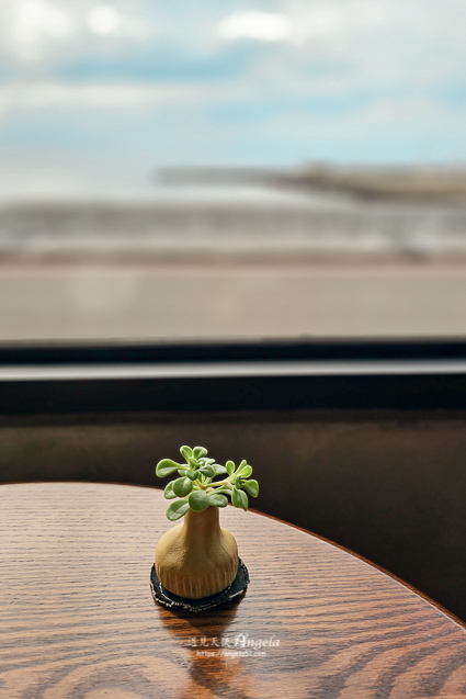 老闆親手打造的室內空間很舒適,木桌椅上的小陶瓷植栽,再加上海景的無敵景觀,整個空間氛圍有股低調的沉靜感。