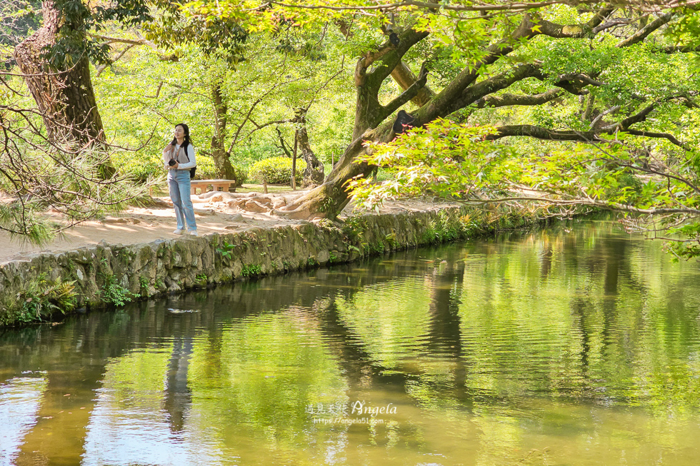 掬月亭後方同時也是栗林公園遊船的主要湖泊就是南湖。南湖的庭園景觀設計唯美,不管從哪個角度看都好拍。從飛來峰拍的栗林公園經典畫面,正是南湖偃月橋與掬月亭這唯美角度。