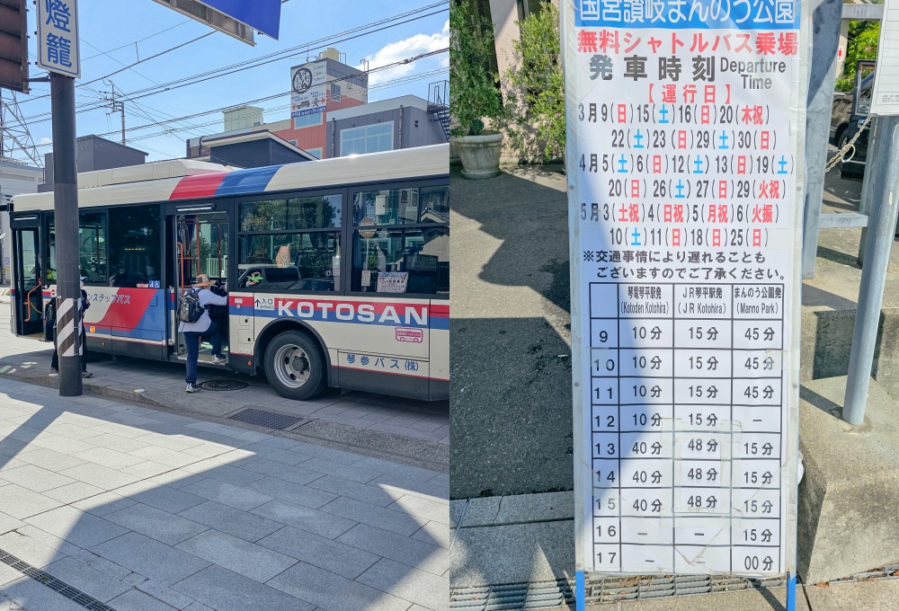 如果是花季期間的周末或是假日(每年時間不一定,平均都是在3/9-5/25之間)前往,有琴電琴平站、JR 琴平站到滿濃公園的免費接駁巴士可以搭乘。