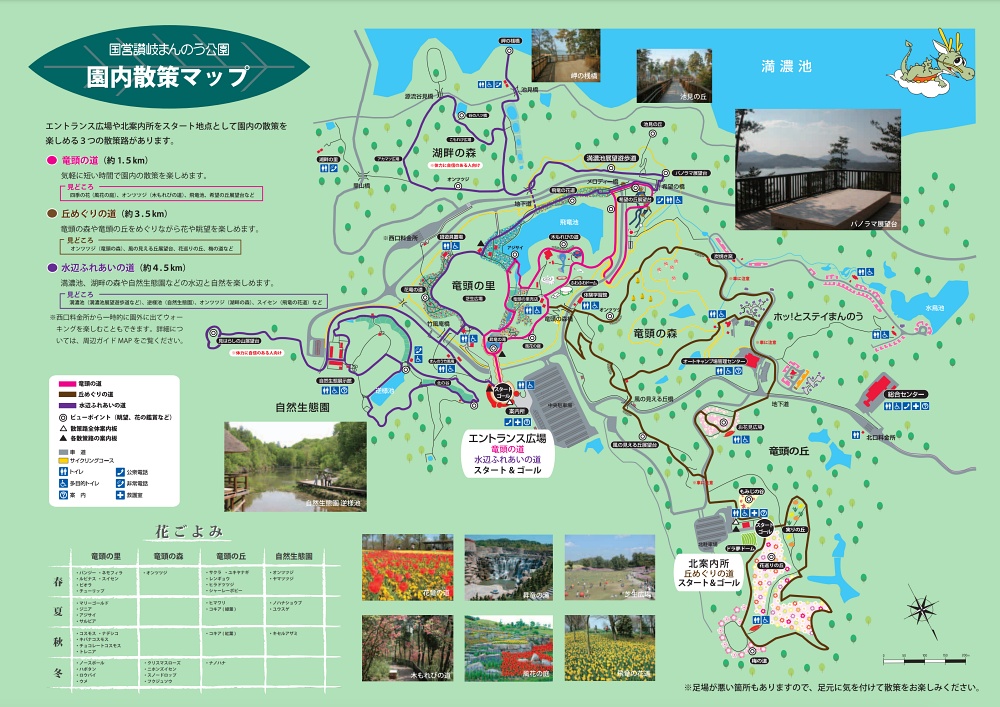 滿濃公園占地 350 公頃,主要公園設施在中央停車場入口廣場這邊。不同季節的大片花海則是在北口停車場這頭的花巡りの丘。