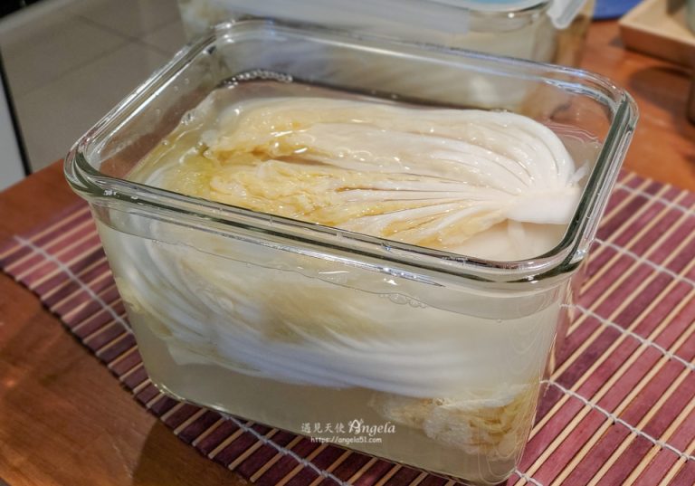 水蓋過白菜並在上面壓重物,讓白菜完全浸泡在水裡面才不會發霉壞掉。(Angela 我是用樂扣盒,上面壓瓷盤加上蓋子上方的突出區域,剛好可以把白菜壓在水面下)