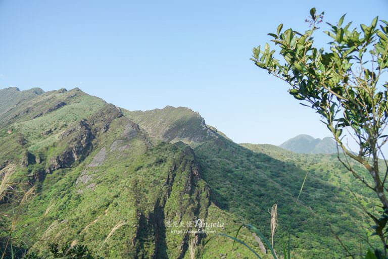 攀岩翻過山頭後,眼前又是一個小山頭要翻山越嶺才能到劍龍稜。大家看到劍龍稜了嗎?上圖那刺如劍龍的山壁就是劍龍稜的登山處!朋友說出這話時,Angela 當下轟轟轟~蝦咪!!爬了一個小時我還沒到劍龍稜登山處耶,前面那些都是前菜。天知道!此時已經有些累了 ( 平常沒運動的人不要來!)。
