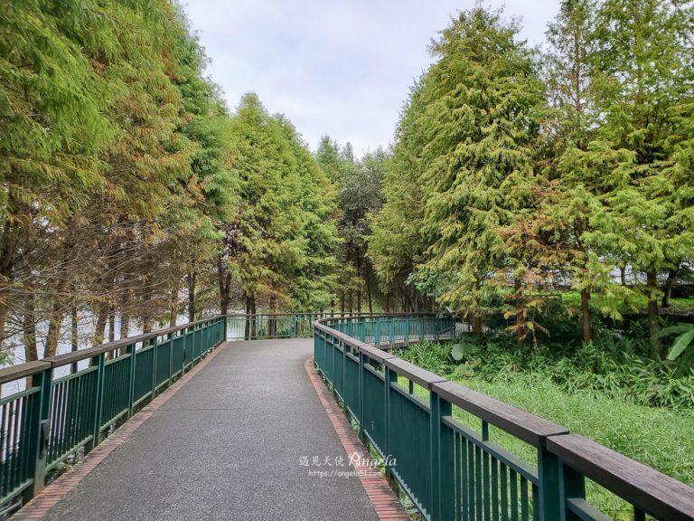 向山自行車道入口前段是 Angela 覺得向山段最美的地方,也是欣賞落羽松最靜謐的位置。比起遊客中心的落羽松,這裡的落羽松林道與湖畔景色更有秘境之感。大家在這都是匆匆騎車而過,因為是車道起點不久,建議回程時可以稍作停留,旁邊有設觀景台,可以好好欣賞美景。