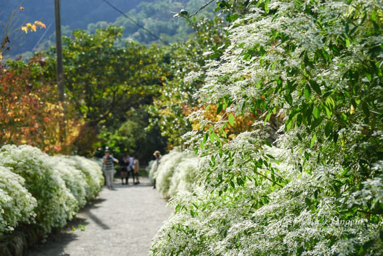轉個彎,最靠近餐廳的坡道上現正盛開白雪木與黃金楓,看到這浪漫的白雪木,第一個雪白的大道就已經讓我們拍照拍個不停。