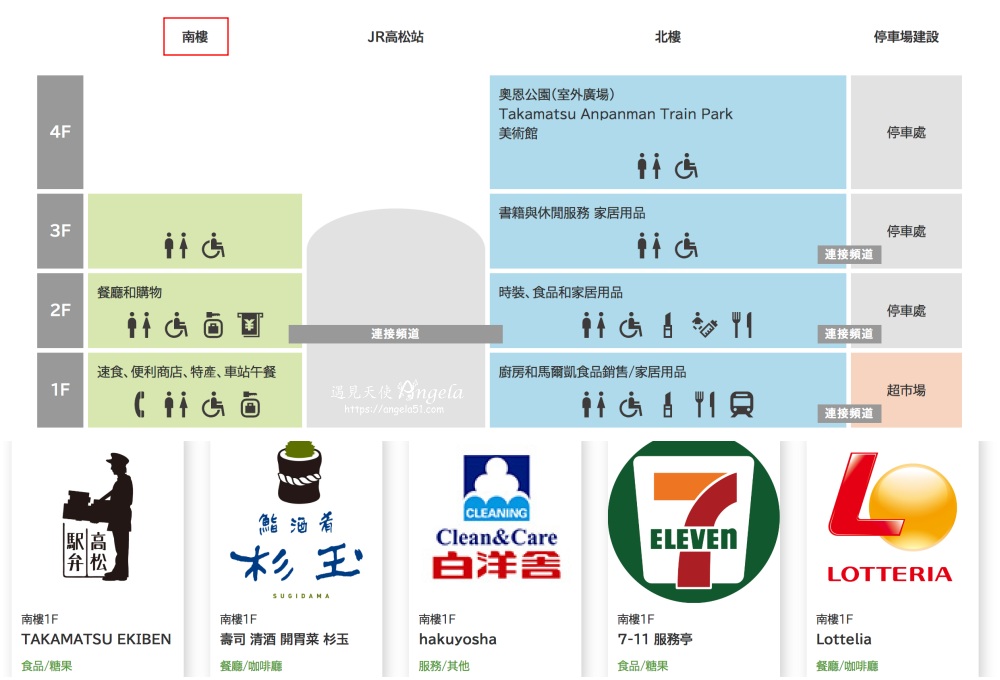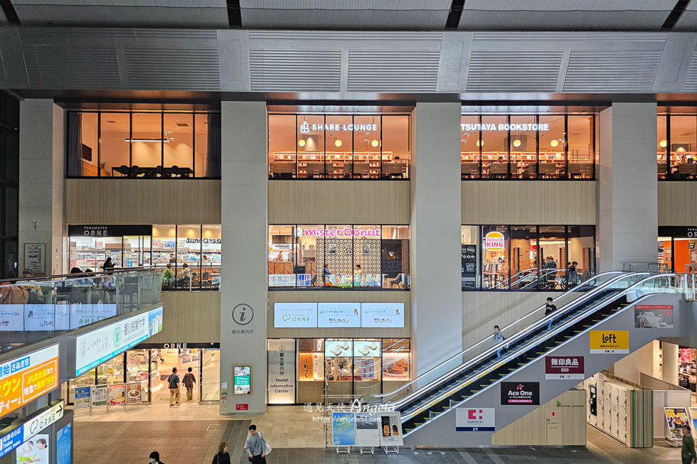JR 高松駅這棟大樓也是 TAKAMATSU ORNE 購物中心的位置。車站出入口在一樓,左右兩邊分為南北樓,是 TAKAMATSU ORNE 購物中心商家的營業位置。