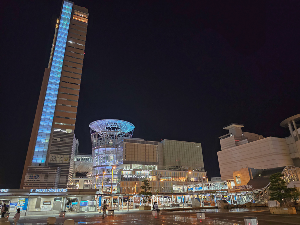 廣場周邊有 JR 高松駅 TAKAMATSU ORNE 複合式購物中心,還有 MariTime Plaza 高松商場。其中 MariTime Plaza 高松商場旁的高松地標塔 29 樓可以免費眺望高松港的景觀夜景。夜晚的高松駅比白天美麗動人許多,白天跳島完,晚上回到高松駅逛街購物吃美食很剛好。