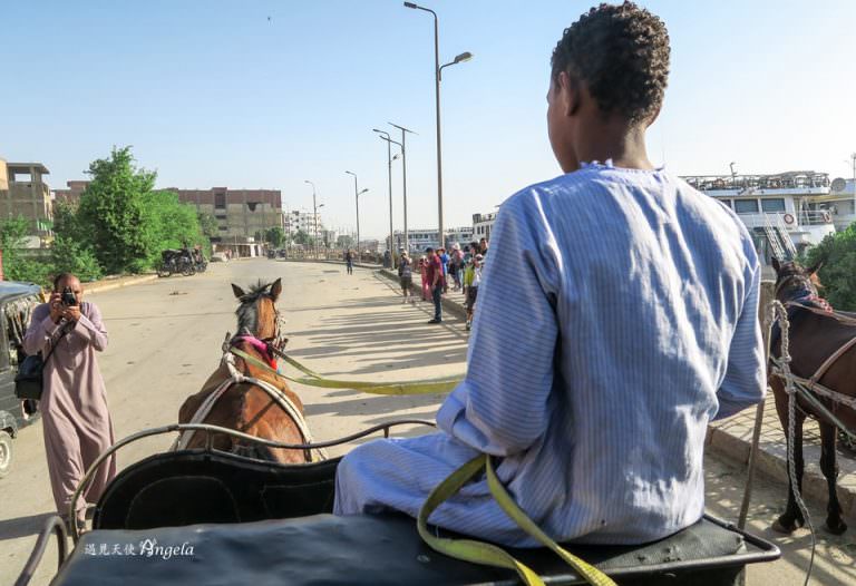因為埃德富這邊的馬車很多有點亂,當時導遊聯繫後還少了4台馬車,所以我們是跟其他團員分批坐馬車到艾德夫神殿的,一台馬車坐2人。從碼頭到神殿車程約15分鐘,途中經過埃德富這個城市感覺很妙。馬車車伕不停的來回載遊客,還會跟對面的車伕喊話,馬路上沙塵飛揚人、汽車、馬車都一起上路,埃及人最真實的日常在這裡最清楚看到與感受到。