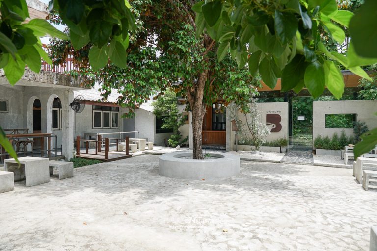 來到 The Baristro x Ping River 門口,就可以看到 L 形的建築體。這裡採自助式服務,座位區以右邊的這棟老屋裡面最多。點餐結帳區則是在左邊的現代風建築裡面,點好餐結完帳在櫃檯稍等一下,就可以直接連同飲料甜點拿到座位區享用。