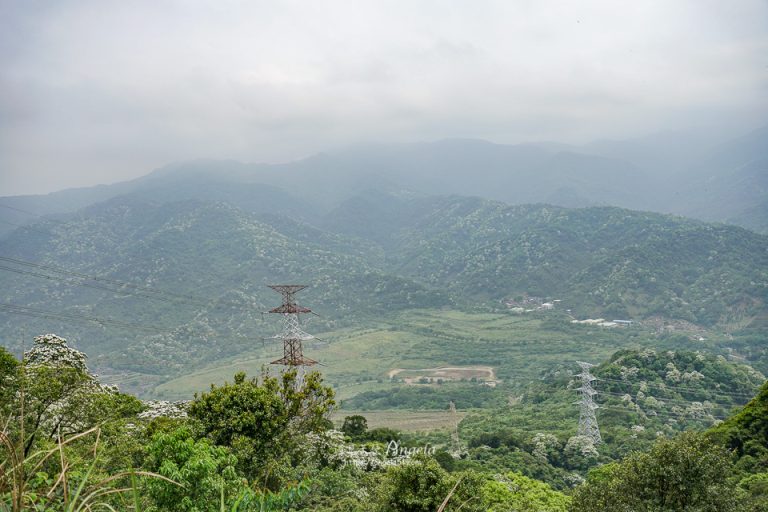 遠處往安坑三峽方向的山頭都是白白的點綴,滿山頭都是桐花,登頂賞花很遼闊!可惜當天天氣霧霾太重空氣品質不佳,有點可惜沒能看到清晰的桐花。