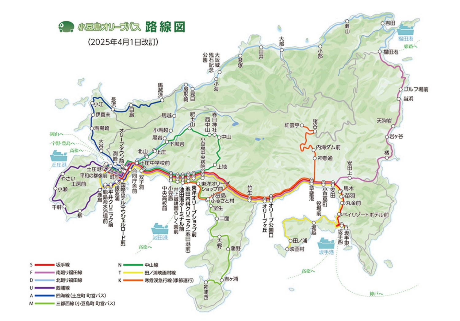 小豆島巴士各路線都會抵達土庄港這個大站,計畫搭乘小豆島巴士的朋友可以官網查詢時刻表。一日遊遊客推薦可以搭乘小豆島觀光巴士,島上的經典景點都在觀光巴士路線上,省去一般搭乘小豆島巴士而需花費轉乘的時間。
