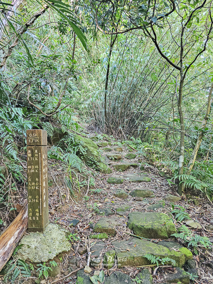 經過四叉路要取滑瀑方向走,過四叉路後是下坡的階梯步道,部分有木階梯部分是原始石階,有些許濕滑要注意踏穩腳步。