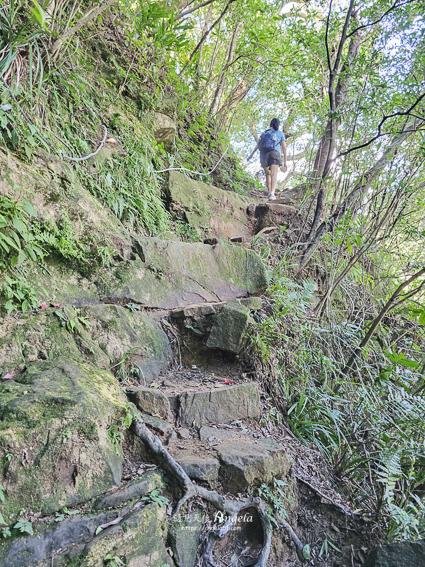 過溪後,接續往滑瀑的指標方向走。從這裡到滑瀑的路況是原始的土石步道居多,而且比較陡升,有幾段石階的落差較大,不常運動的人走起來會氣喘吁吁。