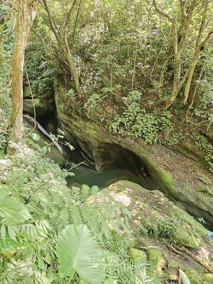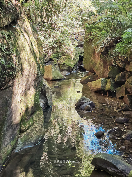 經過峽谷,步道有微爬升,再來就會看到百年土地公。百年土地公這邊是個天然的消暑勝地,旁邊的溪流,水清澈見底,可以坐在大石頭上吹風享受自然綠意。