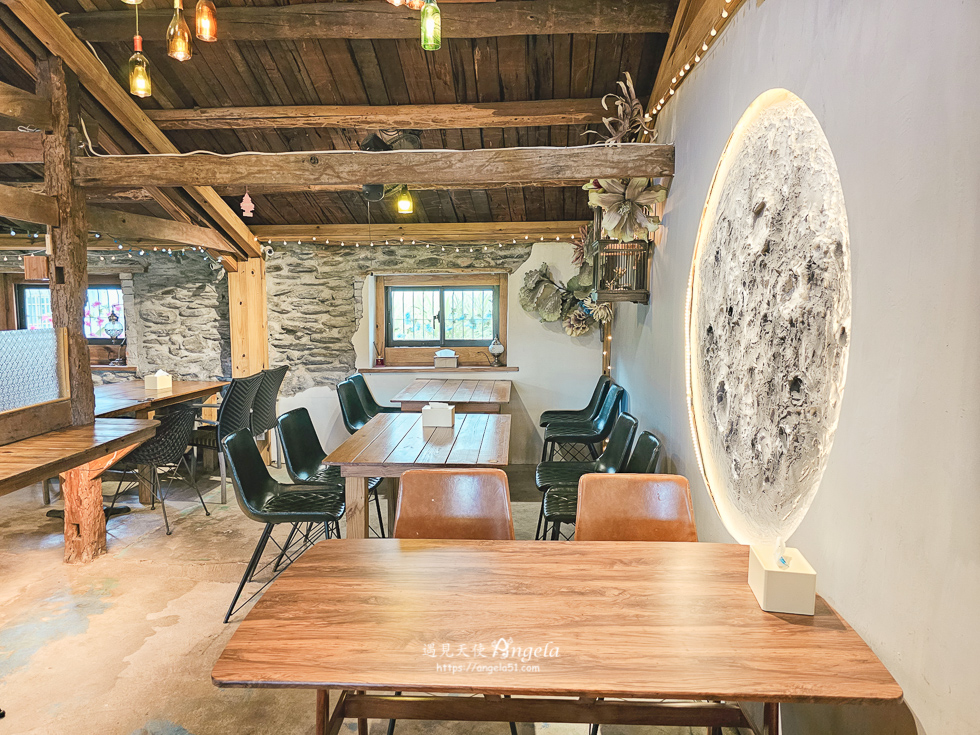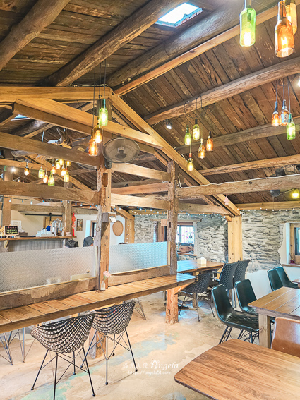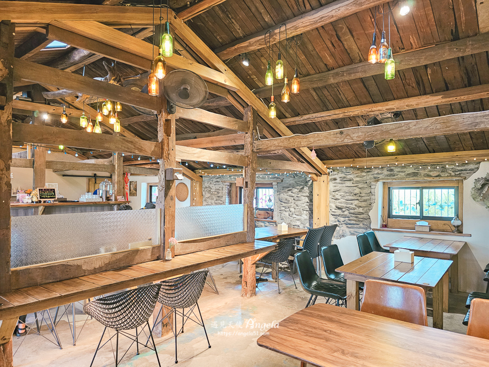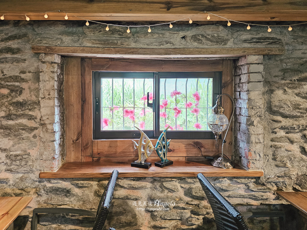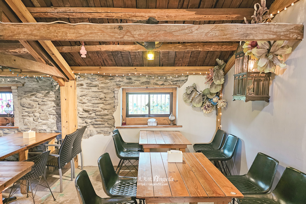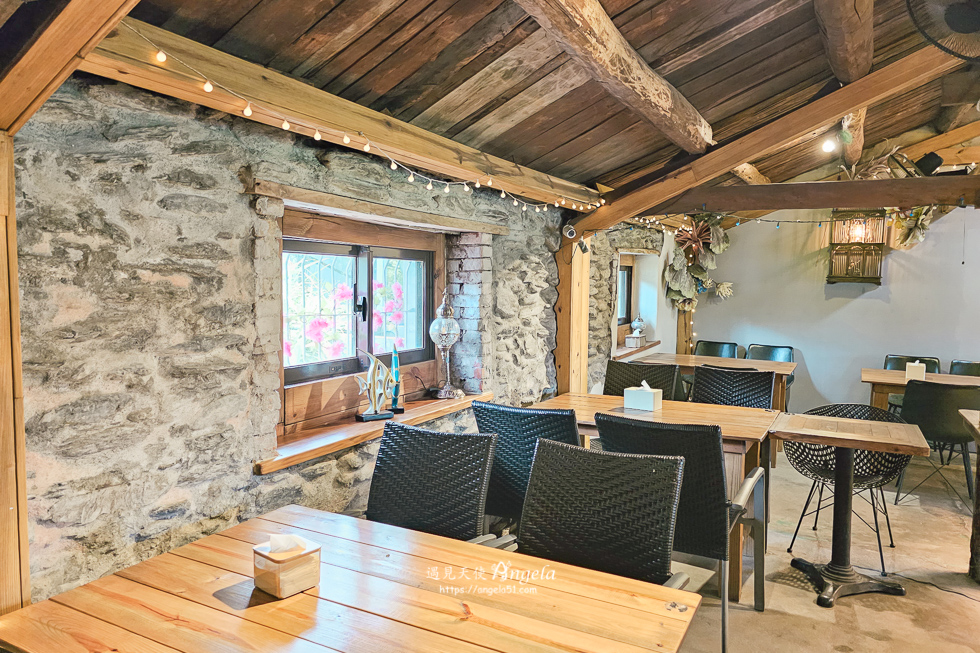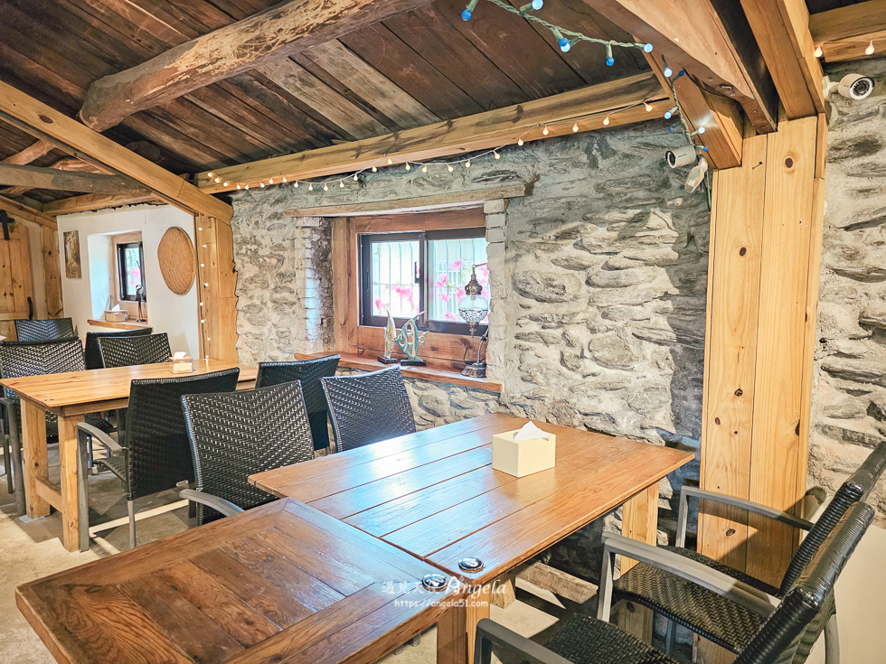 石砌的牆壁、木樑與木窗框,老宅的基本元素都保留著。桌椅就依屋內的格局陳設,用餐的同時也能欣賞老宅的復古美。