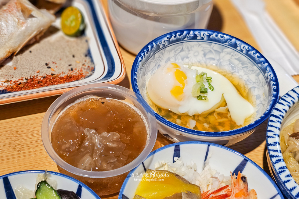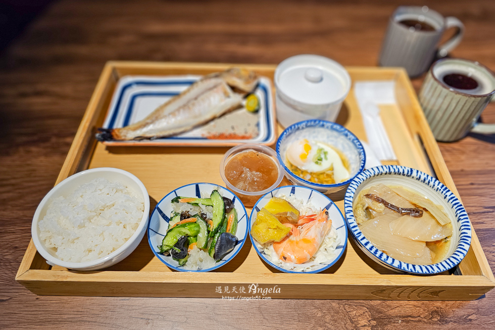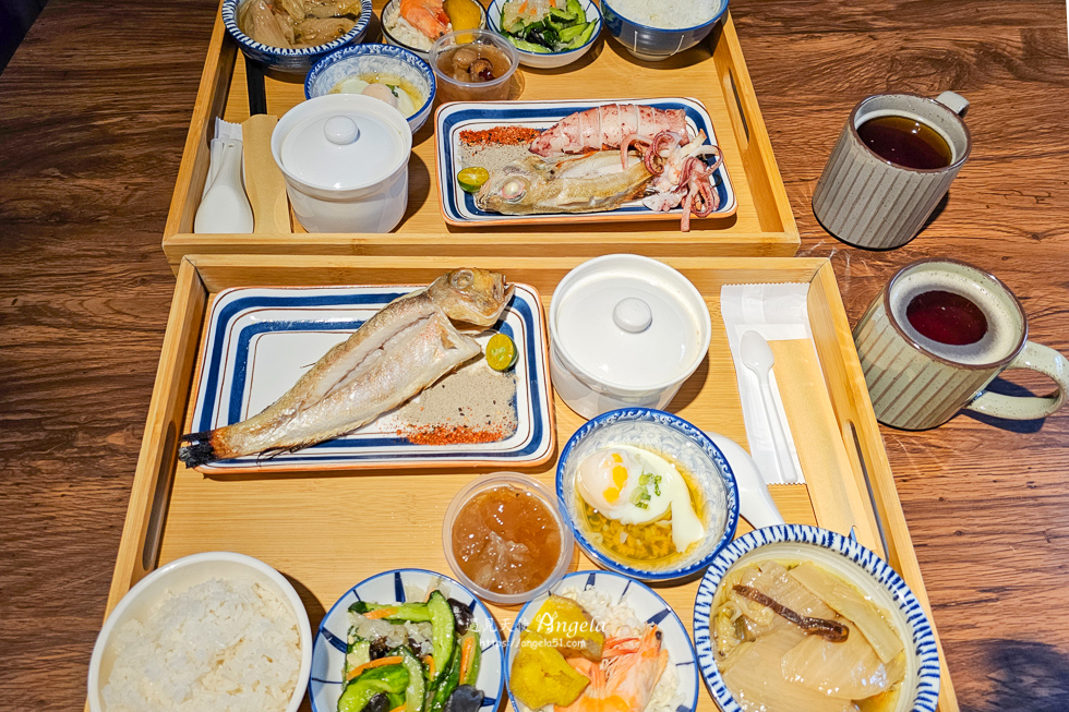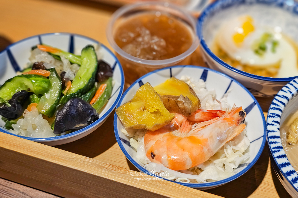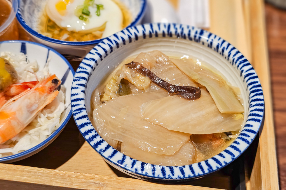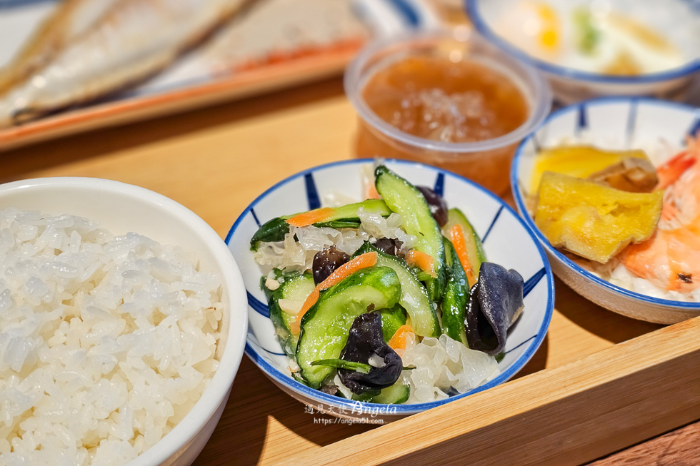 馬頭魚定食,當天的定食配菜有涼拌黃瓜、白菜魯、水煮蝦、地瓜與糖醋高麗菜絲。小菜味道清爽,白米飯彈 Q 有像在日本吃的飯一樣的好吃。定食都還有附小甜點,當天是銀耳,燉煮的軟滑好吃。