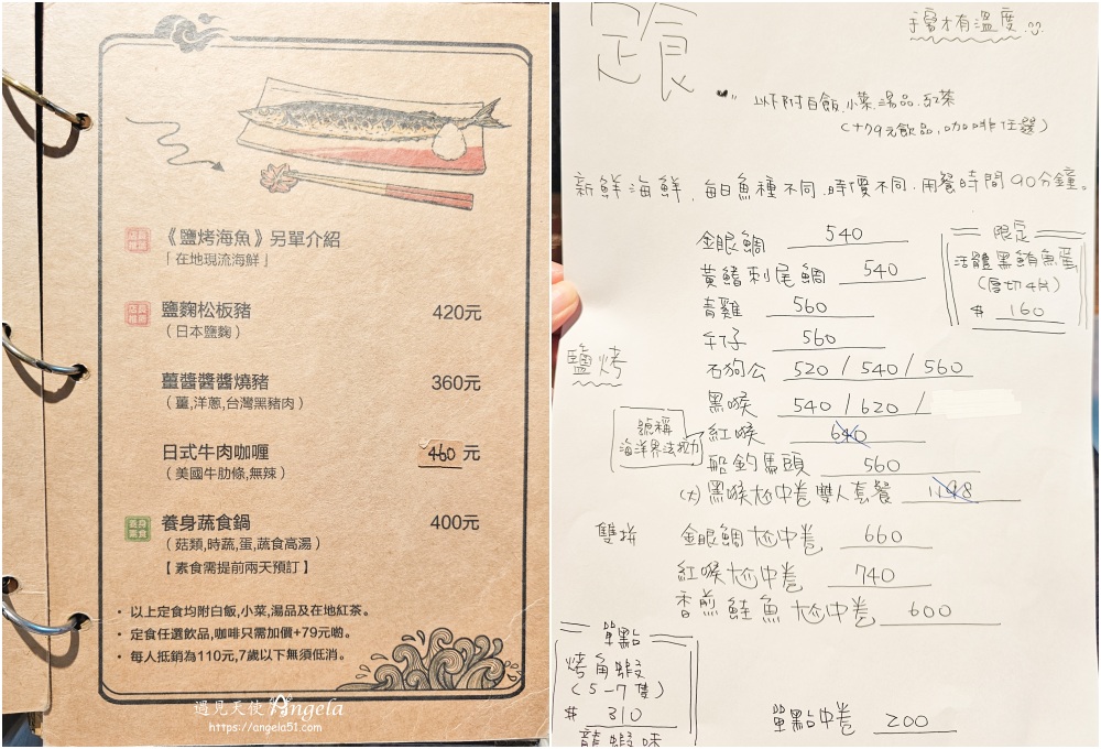 二漁咖啡菜單如上圖,一般常規的定食有豬牛定食料理。至於烤魚定食,則每日菜單提供的鮮魚都不同,要看手寫的菜單。烤魚定食價位平均 5-600元
