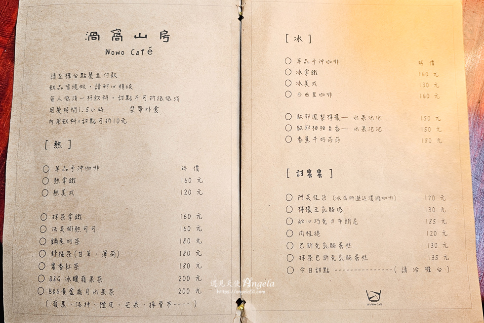 渦窩山房沒有訂位服務,一律現場安排座位。內用消費每人低消一杯飲品,內用飲料加甜點,甜點可折 10 元。用餐時間限制 90 分鐘。
