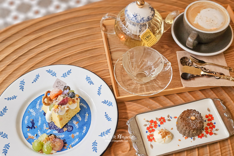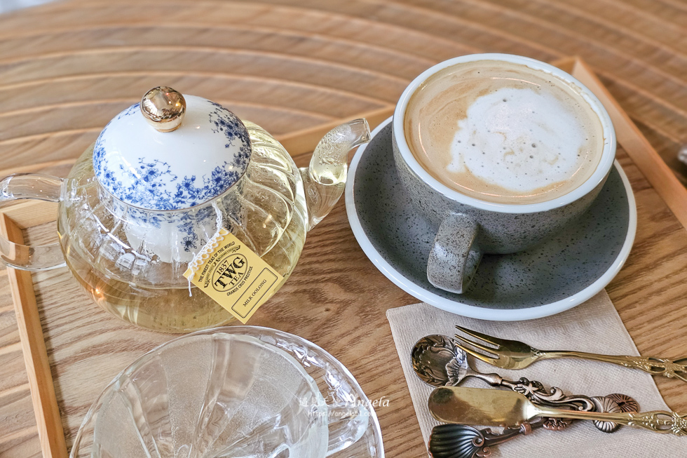 當天點了一壺 TWG 奶香烏龍與拿鐵飲品,甜點選擇了水果戚風蛋糕與焙茶橘香司康。