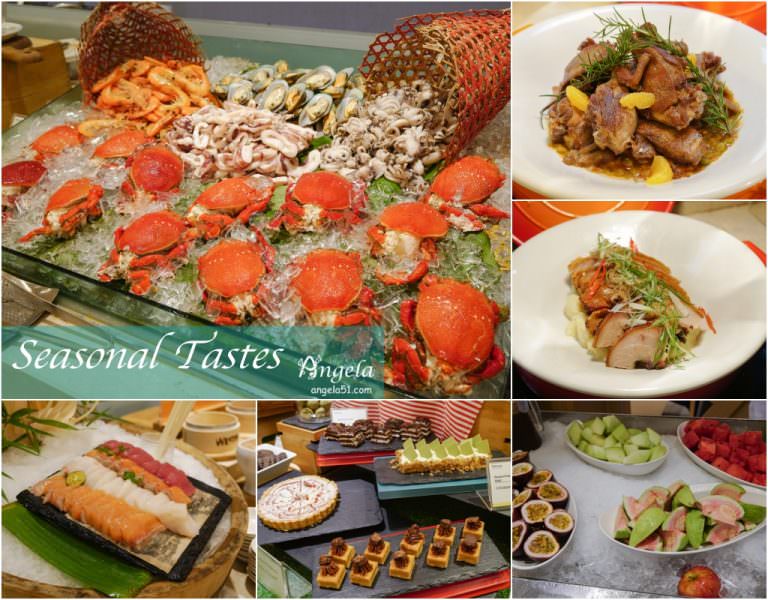 看似不多的自助餐,Angela 覺得餐點種類算是滿剛好的,每樣都吃過一輪也挺飽食了。有海鮮生魚片、熱食區、自助煮麵區、主題風味區、生菜沙拉區、甜點、麵包、水果與現打果汁等。還有現煮的牛肉湯、魚湯以及和牛握壽司與烤魚下巴。